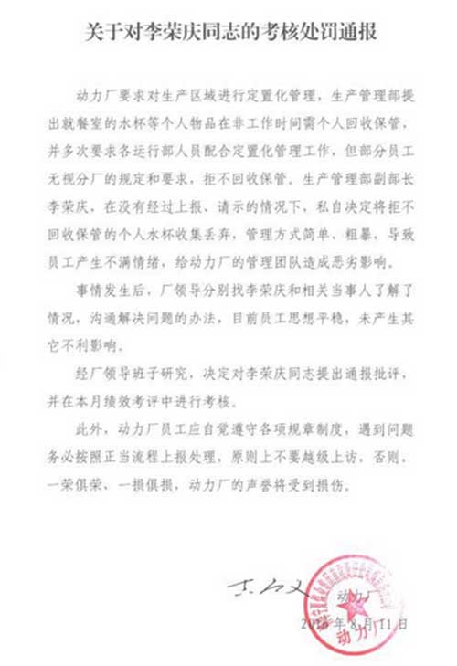 動力廠一名工作人員提供的一份《關于對李榮慶同志的考核處罰通報》顯示,該廠生產管理部提出就餐室的水杯等個人物品在非工作時間由個人回收保管,但部分員工無視此規定和要求,拒不回收保管。李榮慶在沒有經過上報請示的情況下,私自決定將拒不回收保管的個人水杯收集丟棄,管理方式簡單粗暴,導致員工產生不滿情緒,給動力廠的管理團隊造成惡劣影響。