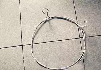 2、如圖,用鉗子將兩個(gè)衣架分別彎成一個(gè)圓形的架,再將衣架的掛鉤朝外扭一下,使其與圓面成直角。